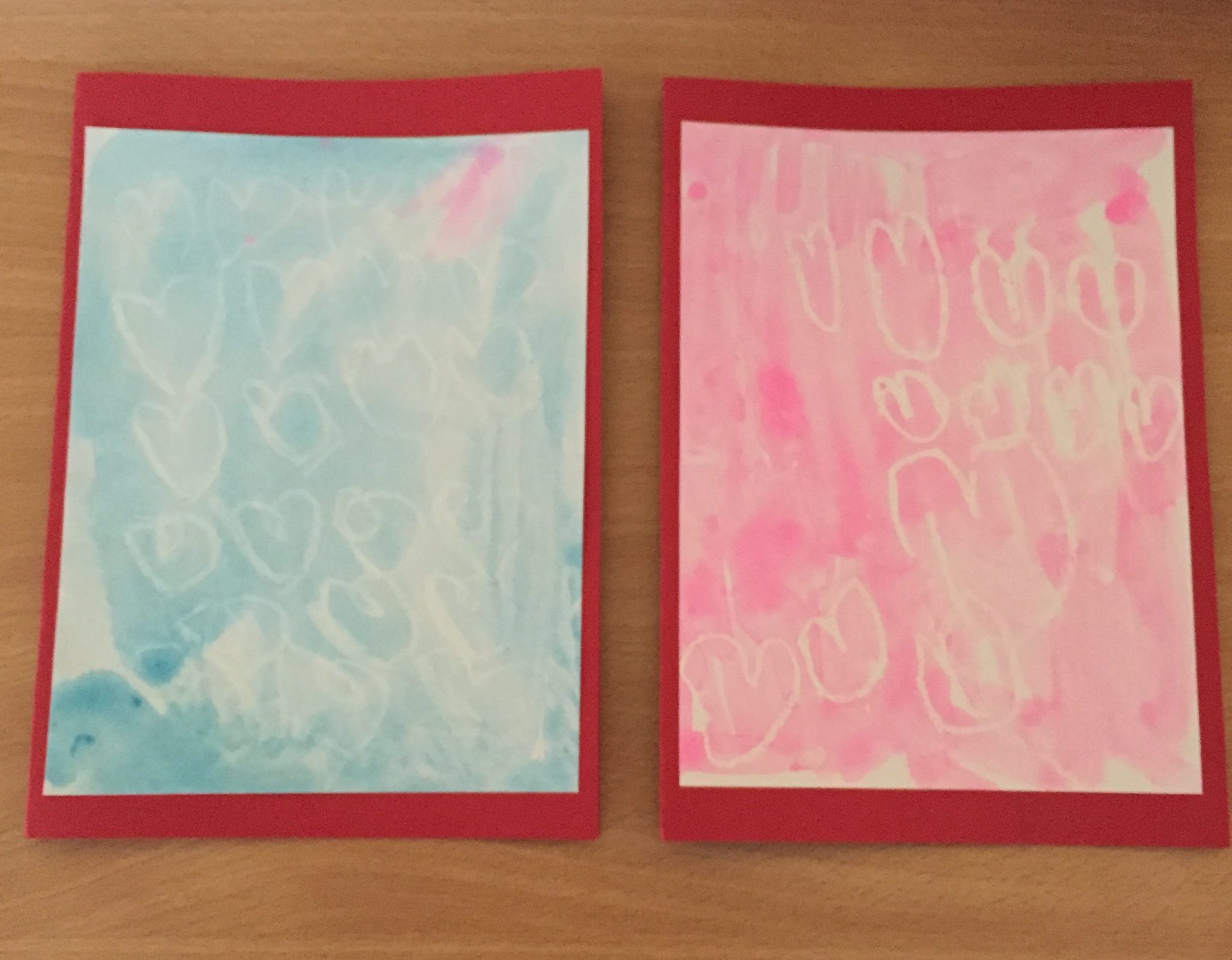 1. Encourage your child to draw hearts on their piece of card. They will need to press down harder than normal or perhaps go over each heart a few times. As the white doesn’t show up you can explain that it’s invisible and you’re going to make the hearts appear!