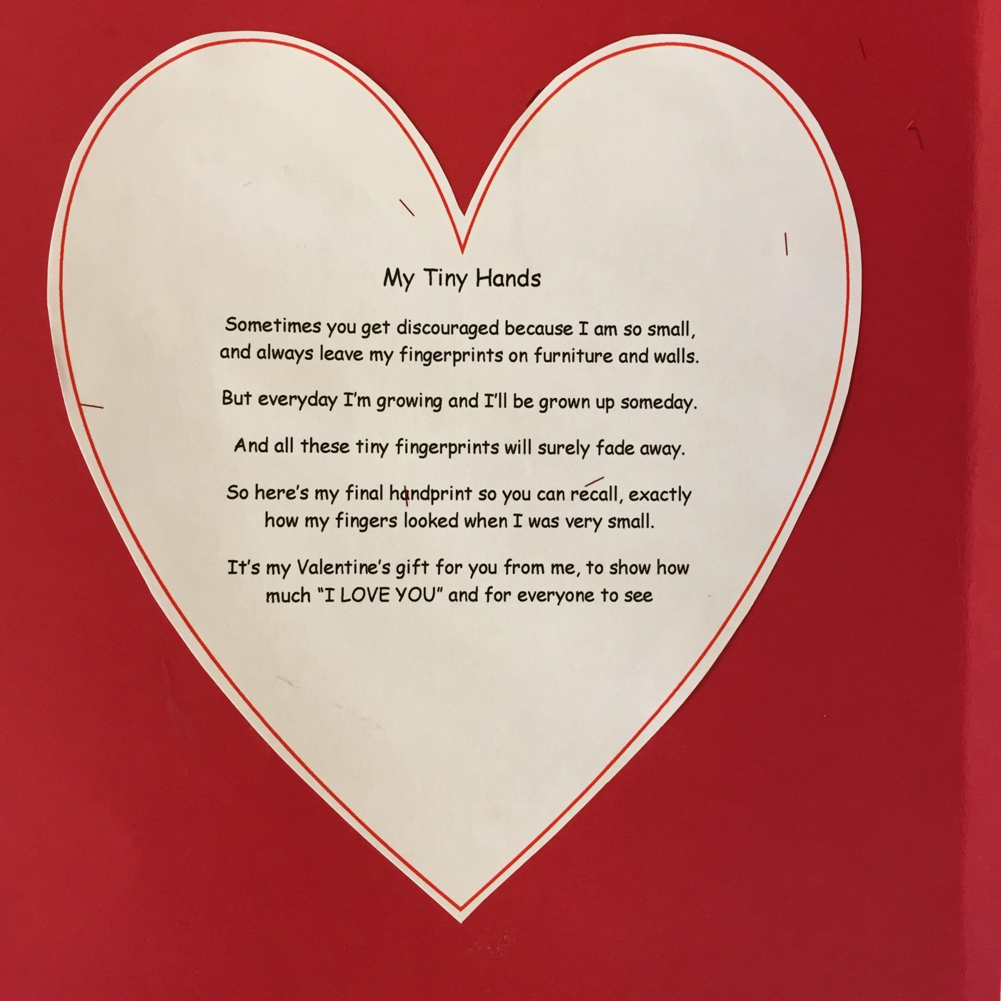 1. Cut out a large heart shape on white card which you know will fit in both your child’s hands.