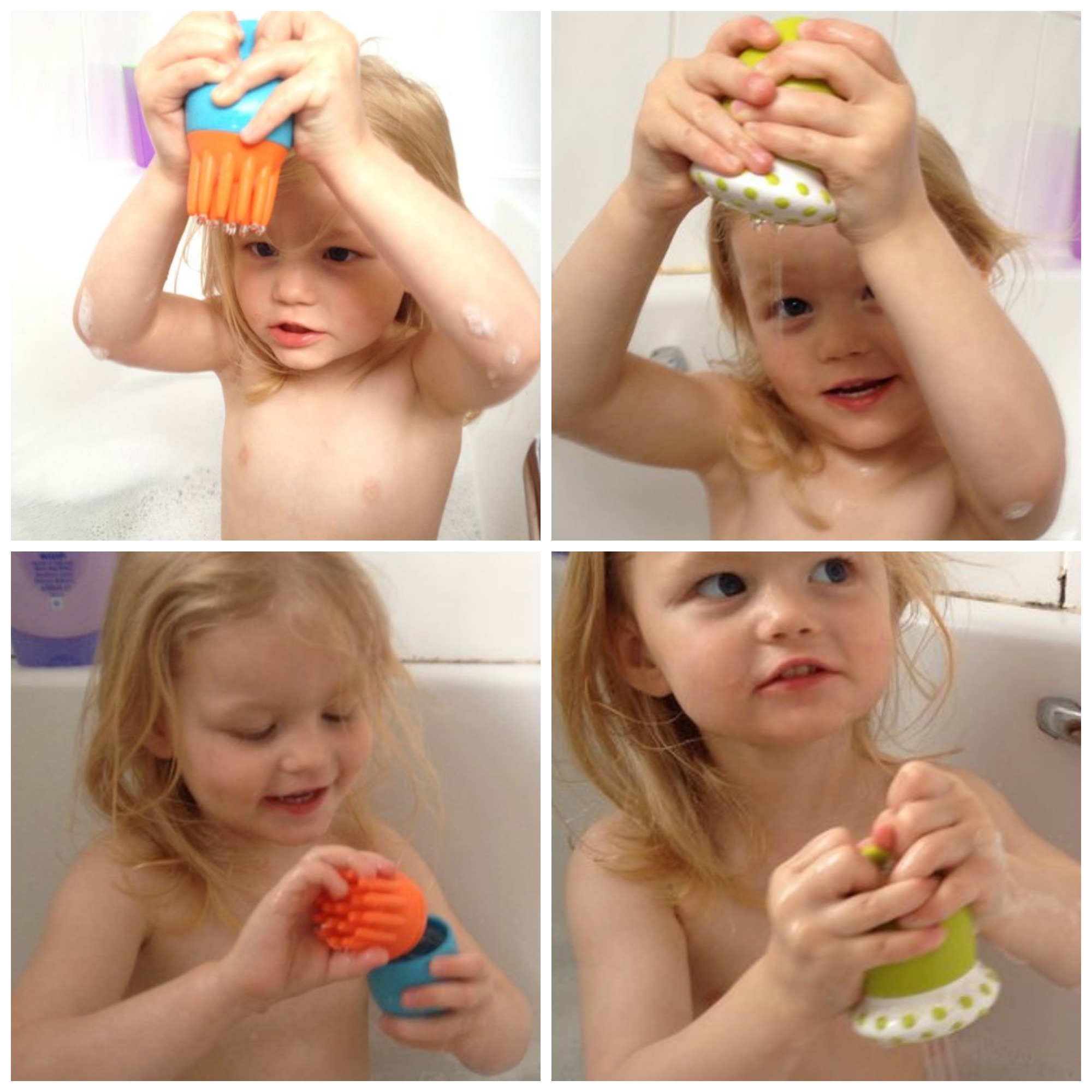 My daughter is 3 and loves bath time and was very excited to have these new bath toys to play with. They are a good size for the children to hold although a little hard to squeeze but daughter soon found she could do it when using both hands. The bottom of the scrubbles twist open To make it easier for the children to fill them up with water and can change which shape goes on them. This is also a clever idea for when you have to clean them as I have found with bath toys in the past some are impossible to clean the inside, these you just twist open and are then able to reach all of the areas to clean. My daughter is 3 and was able to fill them up and twist them herself to loosen and tighten them. She also really loved the fact that once she had undone them she could also use them as containers to fill, empty and pour.