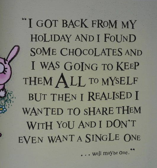 Star rating: 4 – My daughter generally liked the story and the love monster character, and she liked to look at all the different chocolate descriptions. However even after several times of reading the book with her she hasn’t fully understood the ‘moral’ at the end, so I think the book might be even better suited to slighter older (4+) children.