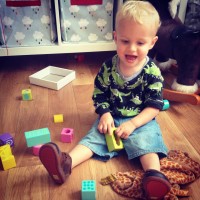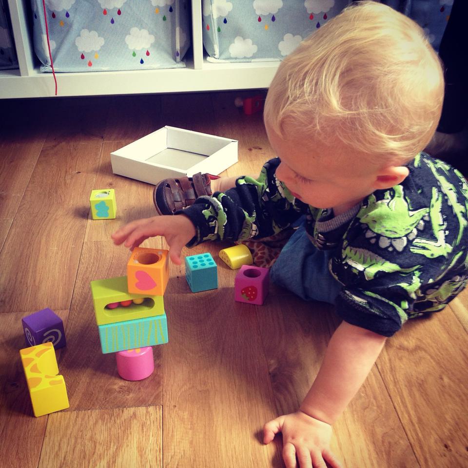 Tate was very excited as soon as he saw the blocks, the cute packaging really caught his eye and he could not wait to play with them. As soon as we opened them his little face lit up! He enjoyed picking each one up and shaking them to listen to the different sounds. He also liked playing with the beads inside the blocks and playing peek a boo with the mirror. Next he began to stack them on top of each other and enjoyed watching them fall over. We then played a game grouping the colours together and talking about the different patterns on the blocks, his favourite being the giraffe print painted block.