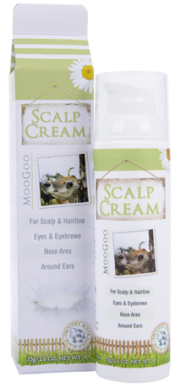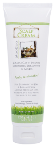 Many people, including babies, are troubled by skin that becomes red, dry and sometimes itchy around the scalp, hairline, neck, ears, eye areas, and along the side of the nose and mouth. These are oily areas of the skin and sometimes yeast on the skin can become more prevalent and cause irritation. This version of our moisturising cream helps return the skin to a healthy condition. Like all our creams, it is safe and non-irritating and can be used anywhere on the body. MooGoo Scalp Cream can also be used as a general moisturiser.