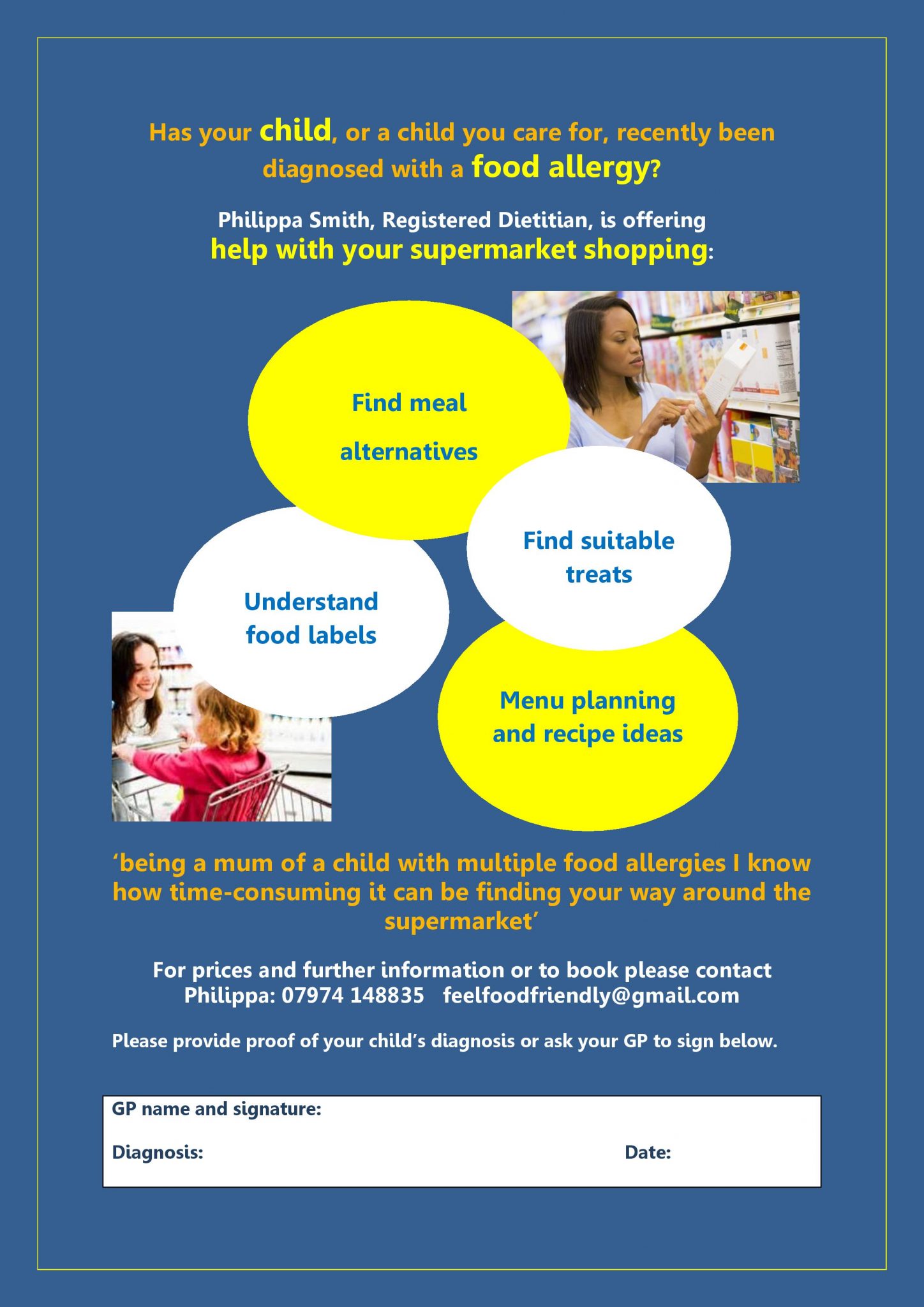 If your child has recently been diagnosed with a food allergy and you would like one-to-one help with your initial supermarket visits, please contact Philippa on feelfoodfriendly@gmail.com you can also visit the website here: www.feelfoodfriendly.com