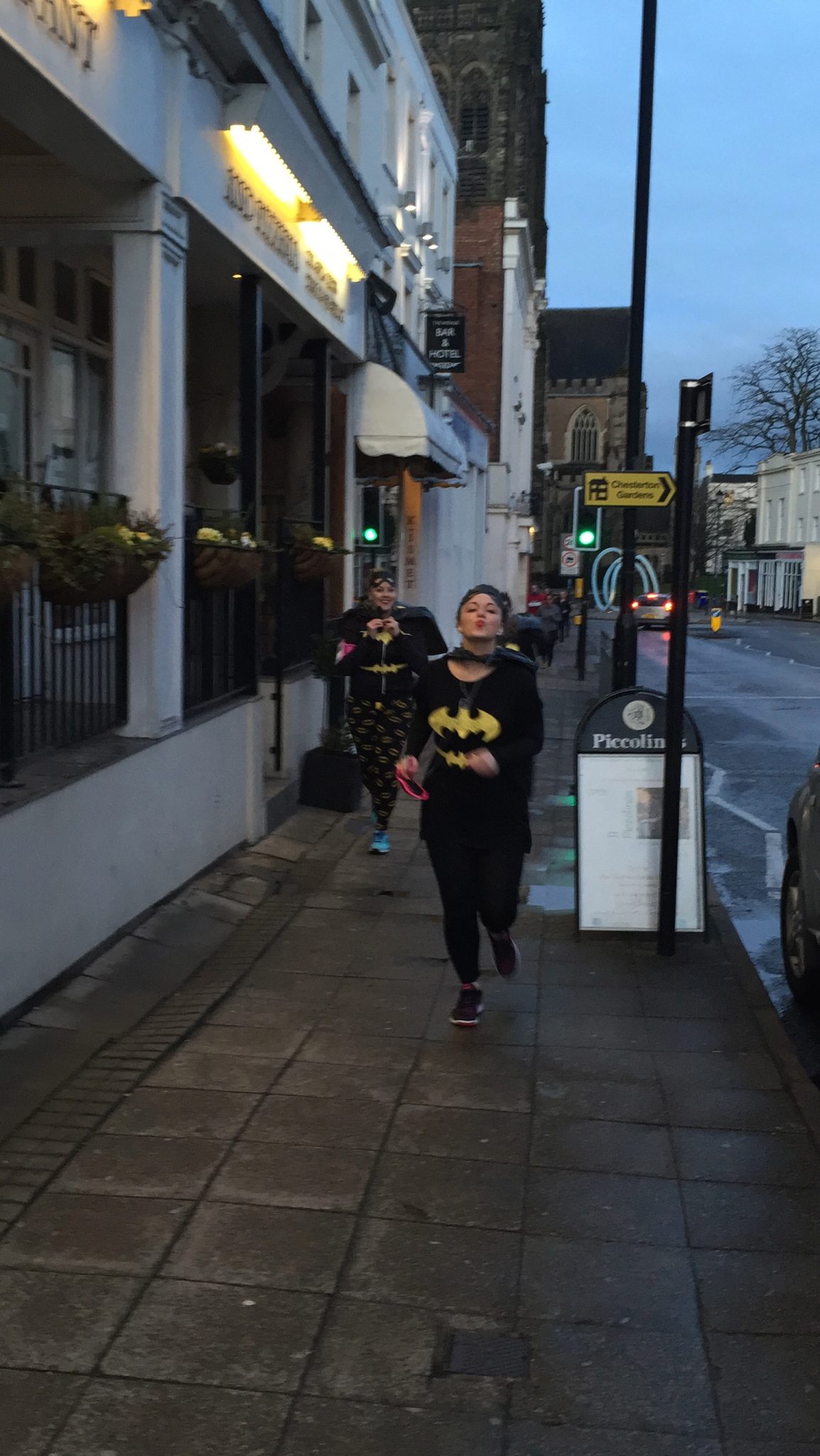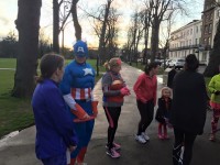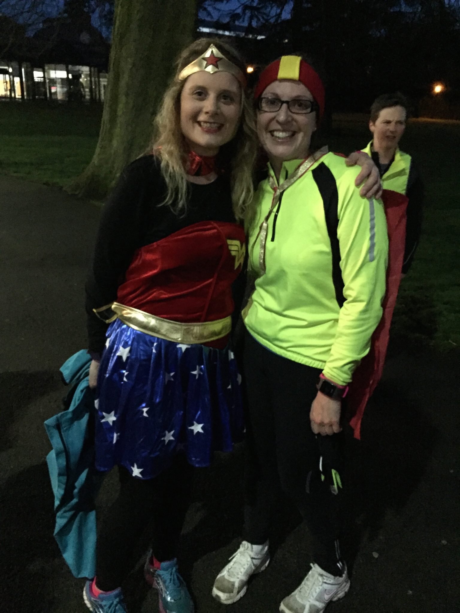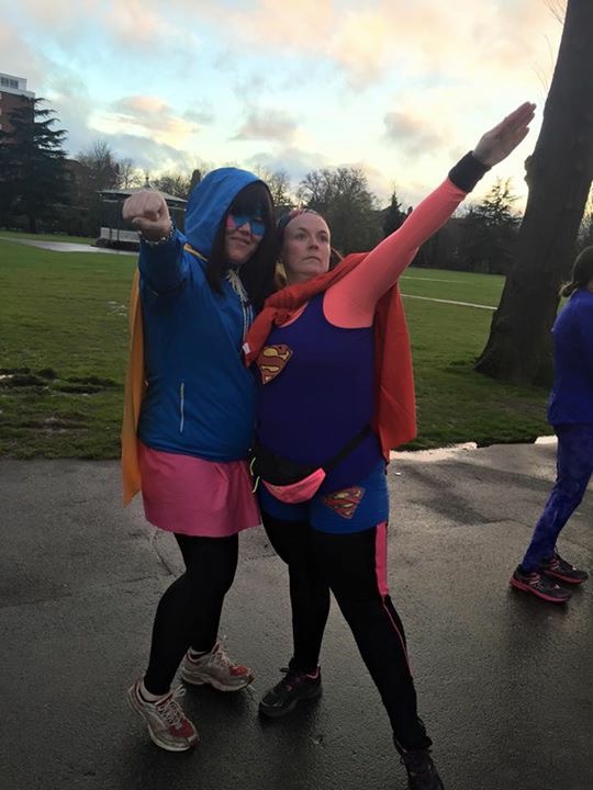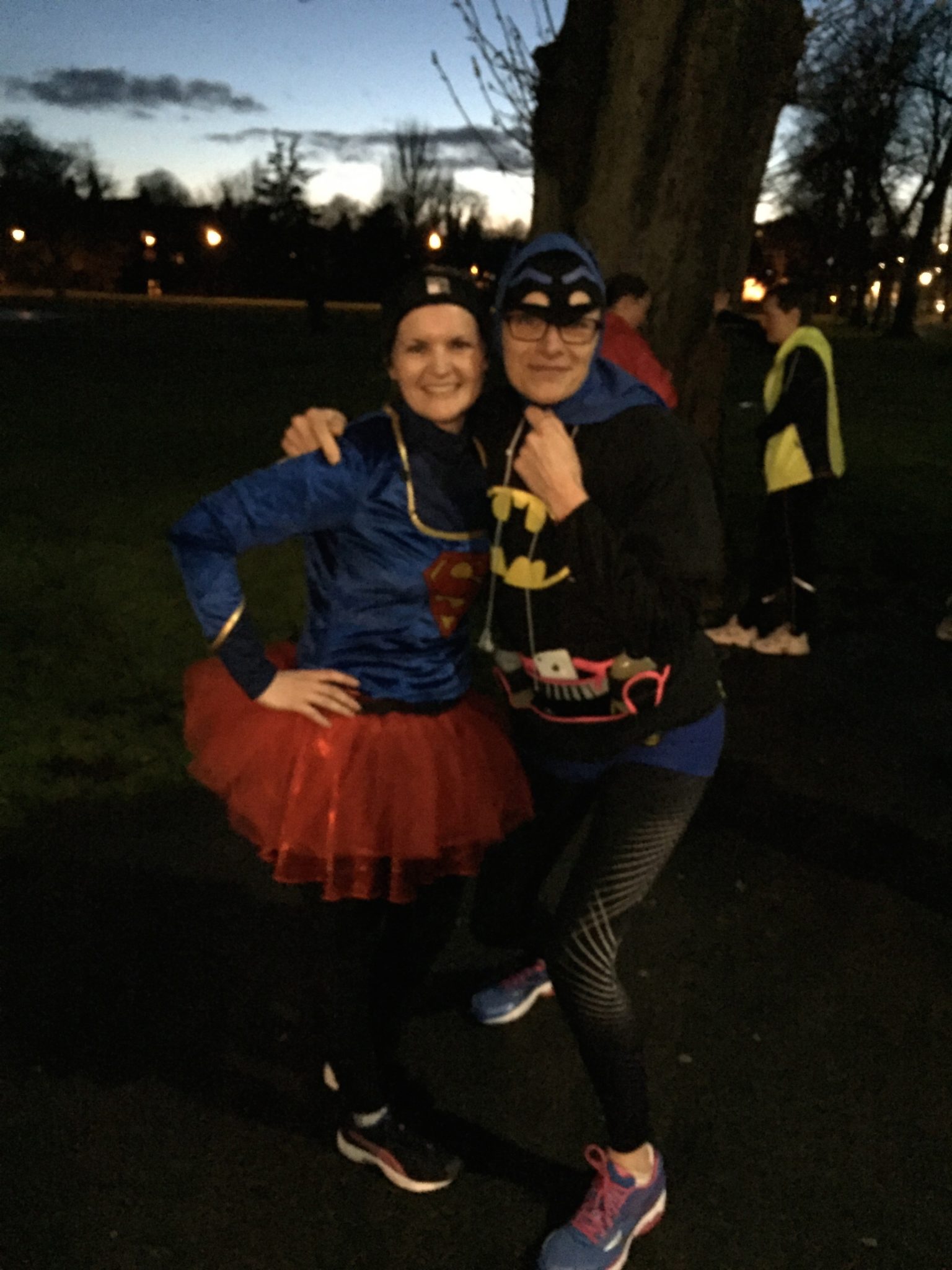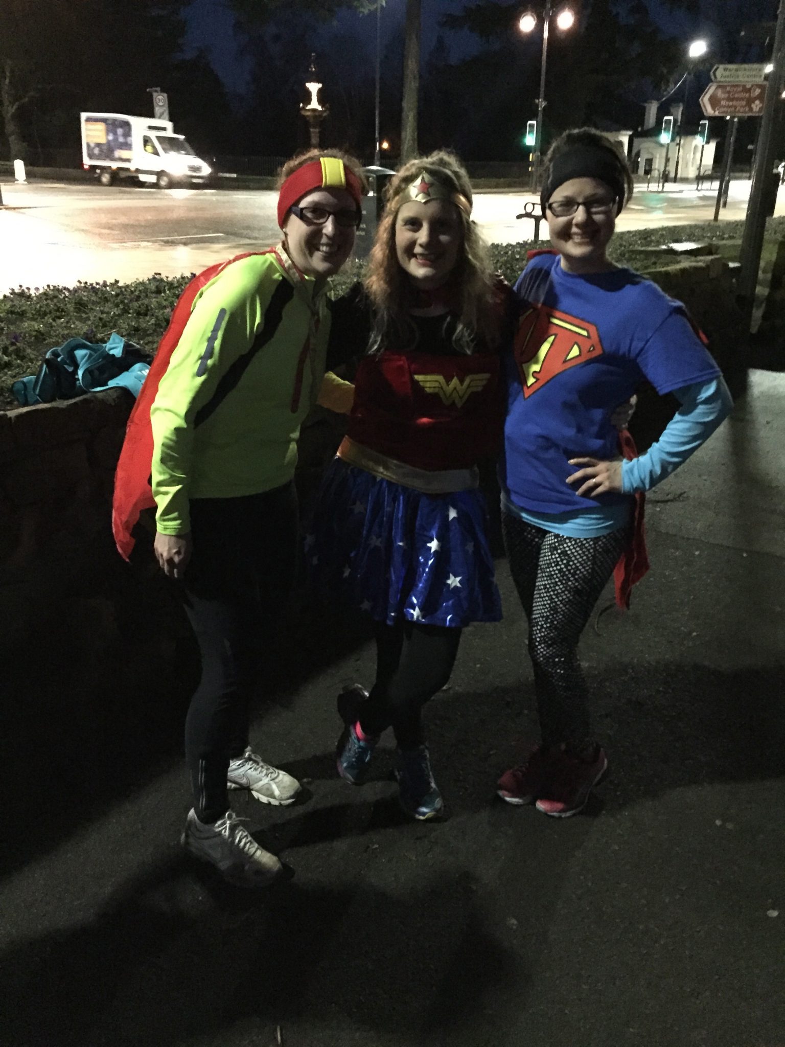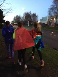 The team of ladies from the group dressed up as superheroes and set upon an ‘out and back’ challenge where they were to run out as far as possible for 20 minutes and then turn around wherever they were and try to make it back to the start in 19 minutes! At the end of the run each team members’ total distance was recorded and added together to make a combined distance travelled.