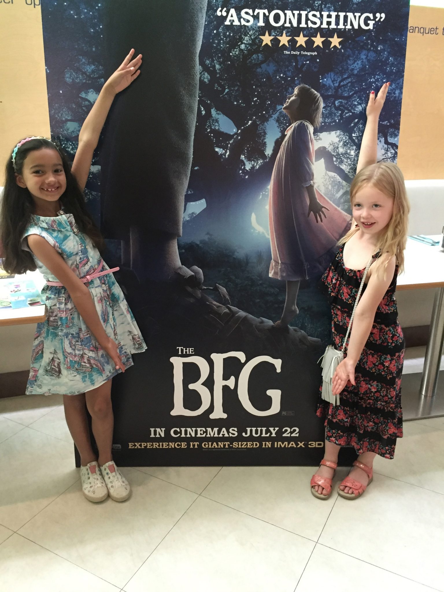 On Friday 22nd July we were so excited to make a special trip to Warwick Arts Centre to watch their premier screening of The BFG in their cinema. Some of you may have read a review I published a few months ago about a Paddington concert there which we took the children to, they loved it, as did we. For those of you who have never been to Warwick Arts Centre, it’s a must for families, the staff are so friendly and welcoming and there is a plethora of cafes and a little book shop to visit plus plenty of parking. The cinema screen seats are comfy and the cushions (not the hard plastic ones thankfully) that raise seats for the smaller children are easily available. The toilets are also situated inside the cinema itself so if needed you can make a swift quick exit with a small person you can do so without a mass exodus. We were treated to Frobscottle cocktails and scumdiddlyumptious popcorn for the screening and the children got to meet ‘The BFG’ himself. We were VERY excited!