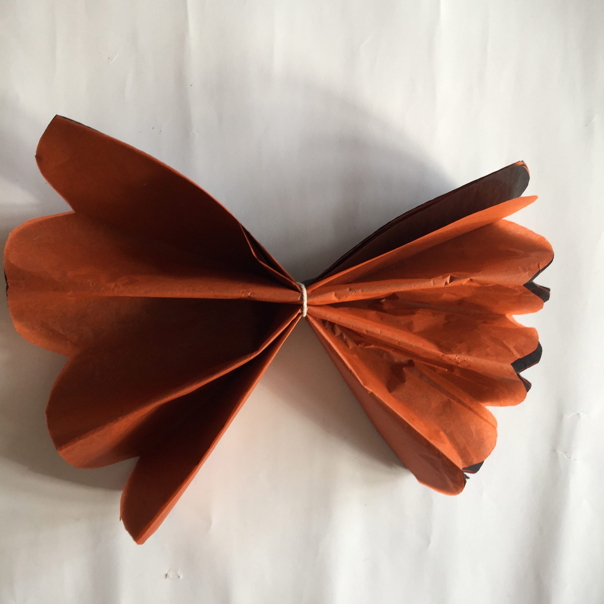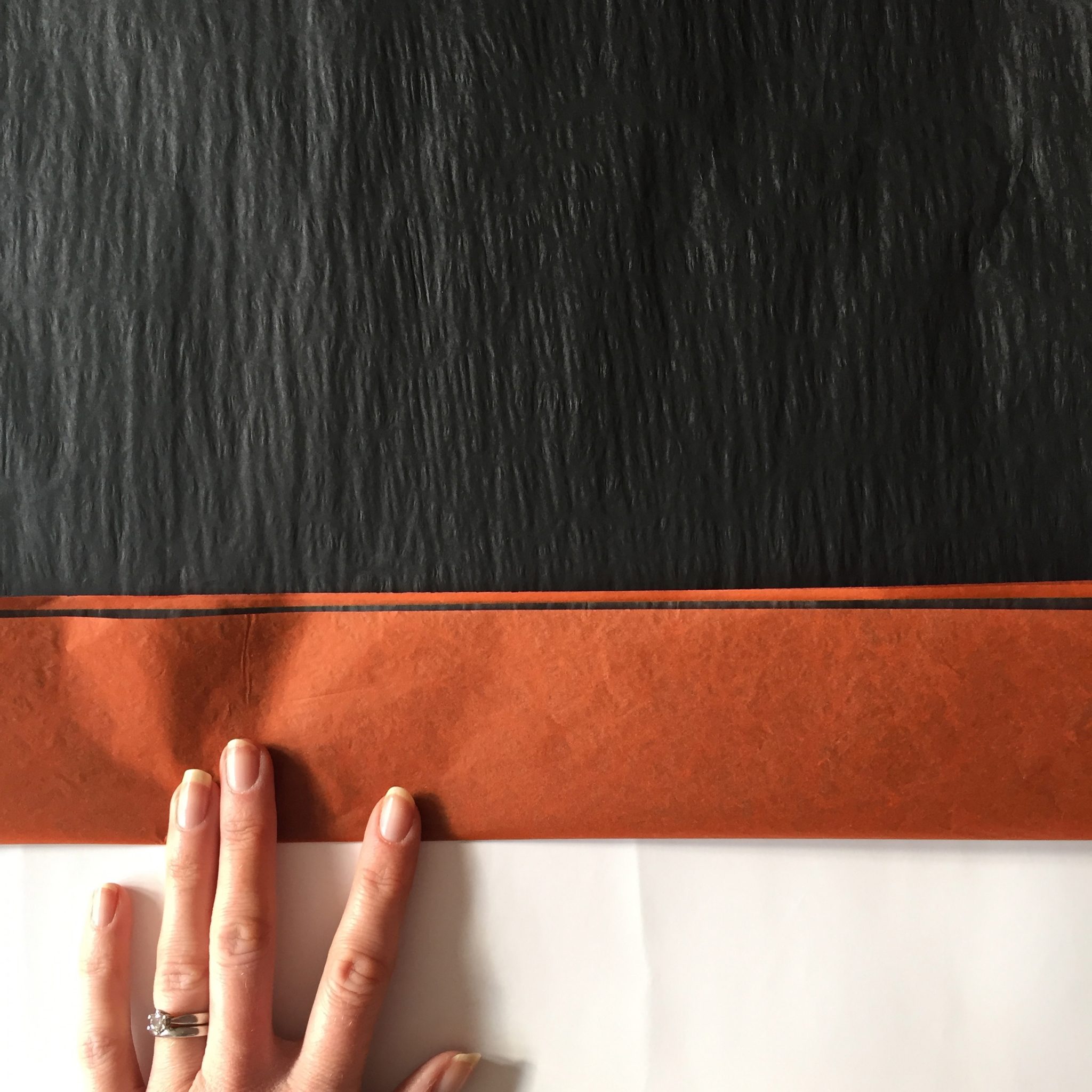 1. Count out 4 sheets of black tissue paper and 4 sheets of orange tissue paper. Layer these black, orange, black, orange and so on.