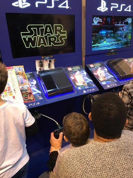 Next up were my son’s favourite bits, firstly “The LEGO Star Wars: The Force Awakens Videogame Exhibition” which had its UK premiere at Brick Live. There were plenty of consoles to use and he loved playing as a Storm Trooper with Daddy.