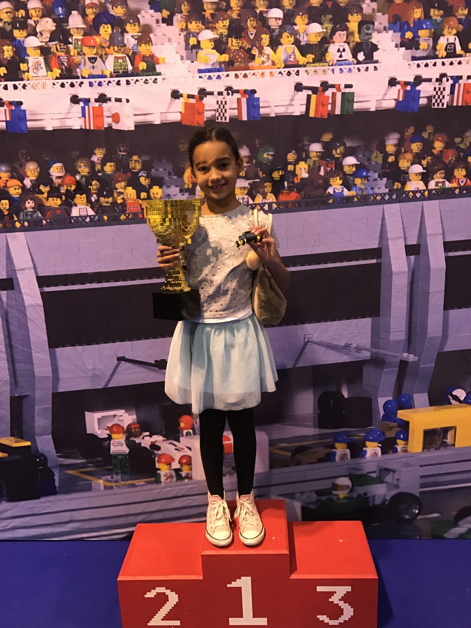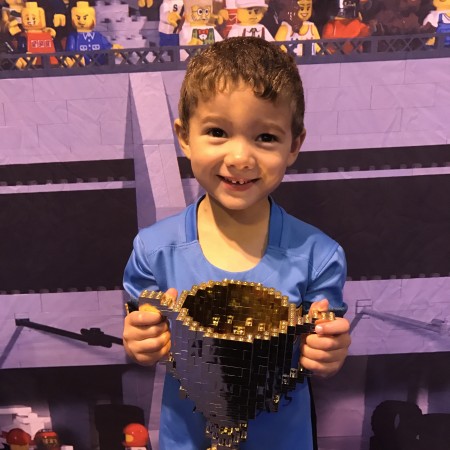 Another firm favourite was the race tracks area where children can build their own lego racing car and race them down the ramps, we spent a really long time here as the children kept modifying their cars to make them bigger and faster! It was quite busy though and wheels were running out so we finally managed to move them on to one of the huge lego pits instead to create something different, not before they had their pictures taken on the winners blocks with the winning trophy (made of lego of course)!