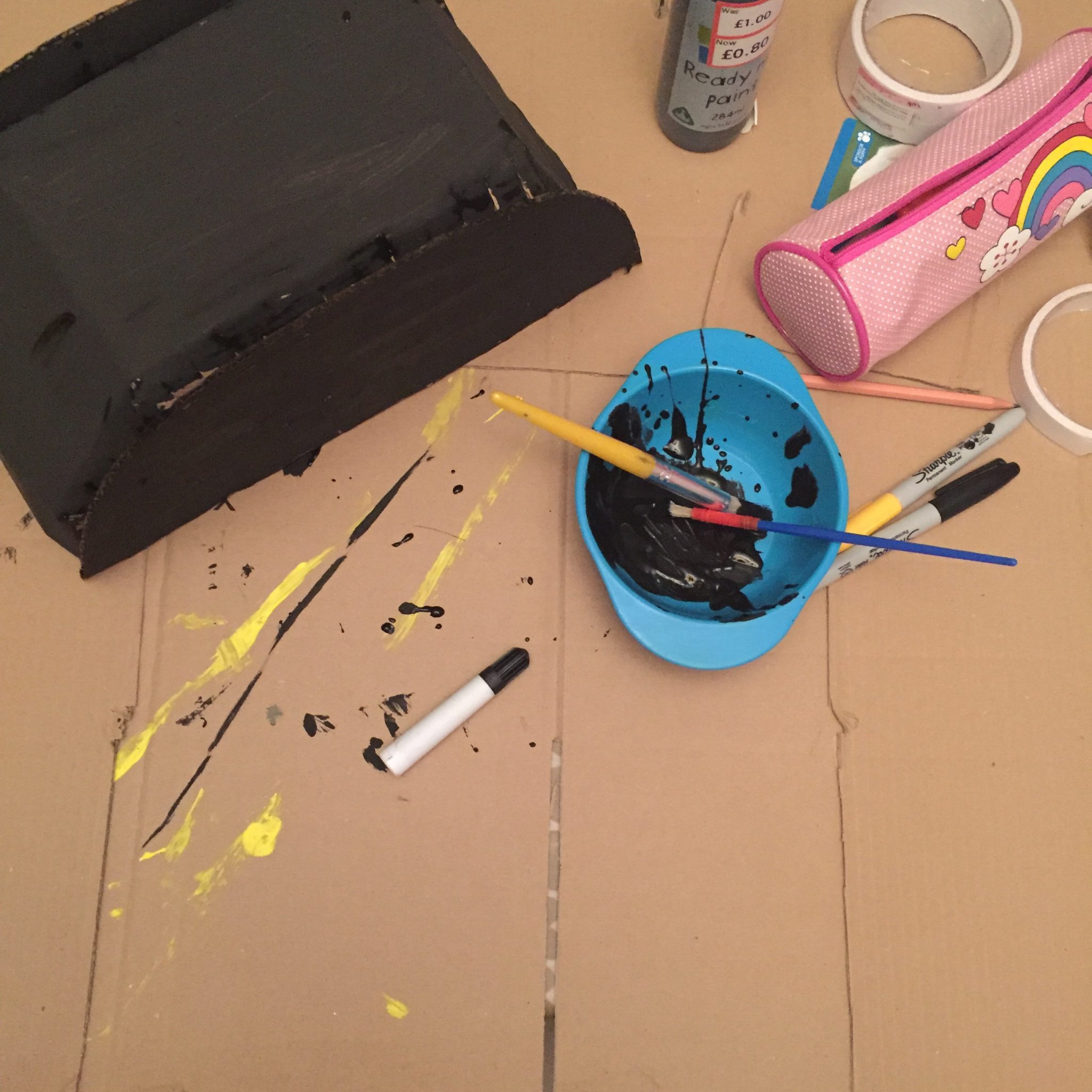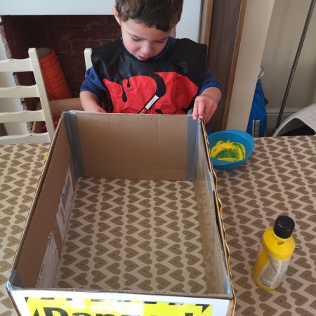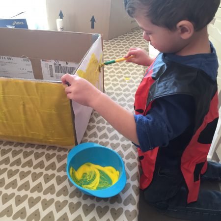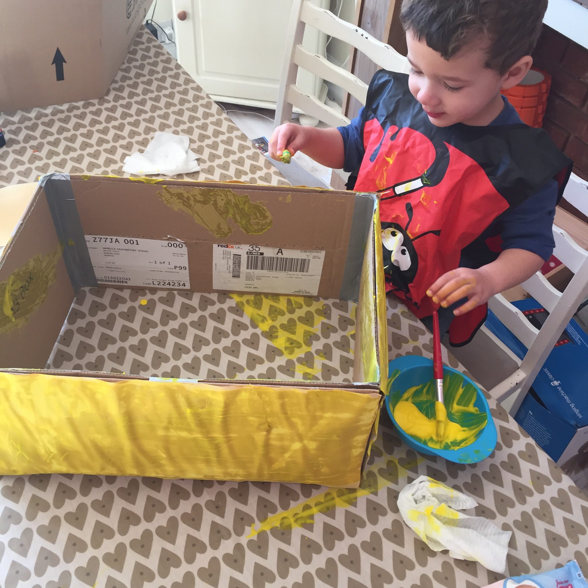 So I thought. I can totally do this. I got the paint box out, grabbed a cardboard box from our local Homebase store and began to ruin my dining table cloth by letting Isaac loose with the yellow paint which says it’s washable. It’s not, ELC!