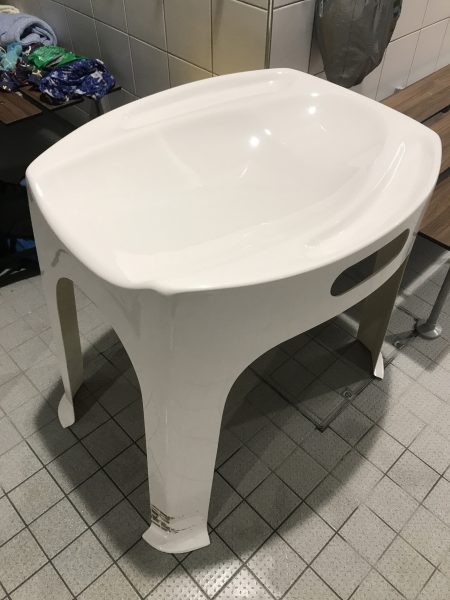 The female changing rooms are straight ahead of you and you will need a NEW £1 coin to use the lockers. I’ve included pictures below to give you an idea of locker size. There are communal showers and two shower cubicles with doors. There are also three toilets (see images below). There is a small area with two hairdryers and space for another. The locker area has a bench directly in front of the lockers, meaning if two people have lockers nearby it would be hard to change in the same area, I can see this being an issue at busy times especially if you have a family. The addition of a central benched area would have been more useful here allowing people space to put their belongings. There is one small plastic baby changing table and some benches in front of pegs too. These changing rooms were clean when we visited though there was only one bin which is a yellow one, not a normal one.