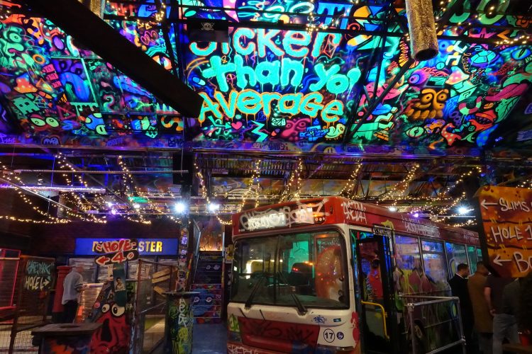 As soon as you step from the Custard Factory and in to Ghetto Golf you’re transported into a bright, graffitied world of craziness. Old school hip hop & RnB music plays throughout the building adding to the atmosphere and the whole room is adorned with fairy lights bowing across the ceilings. Immediately in front of you is a disused bus which has been transformed into one of the holes on the course. The whole building has the wow factor! There’s various other themed rooms such as a (pretty freaky) old style Blockbusters and an old school pub, there’s a retro gaming area and even a hen house. There’s nothing normal what so ever about this place, but it’s different and I like it!
