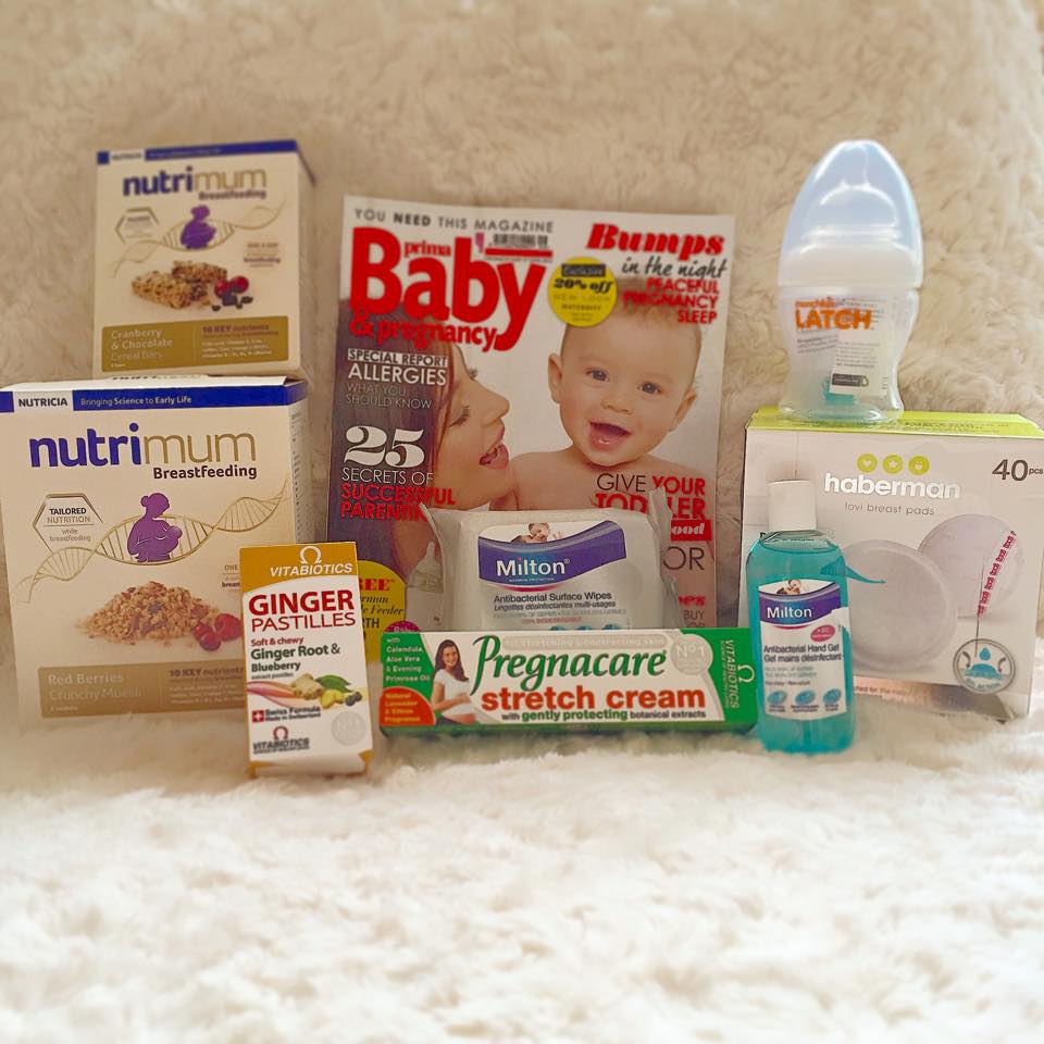 Contains one current Prima baby and pregnancy magazine, Milton hand gel and Antibacterial Wipes, Pregnacare Stretch Cream, nutrimum Breastfeeding muesli & cereal bars, Vitabiotics Ginger Pastilles and Munchkin UK latch baby bottle!