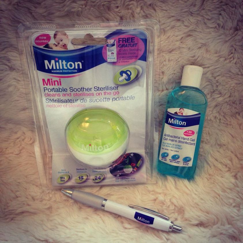 TO WIN these goodies: A milton portable soother steriliser with mini sterilising tablets, a Milton antibacterial hand gel and pen