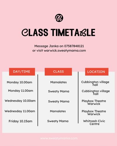 To secure your space, go to warwick.sweatymama.com or contact Janka for a chat 07587848121